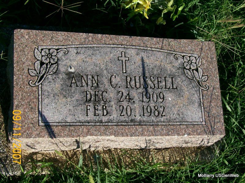 | RUSSELL, Ann C. | Dec. 24, 1909 | Feb. 20, 1982 | Research Note: Buried next to Edgar L. Russell. Possible marriage record: Edgar L. Russell married Lucy Ann Cox on Mar. 3, 1909 in Hopkins, Nodaway Co., MO. | MO Marriage Records Phyllis Long Photo Jay Trace |
