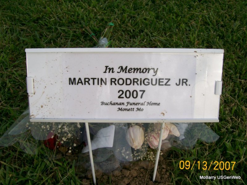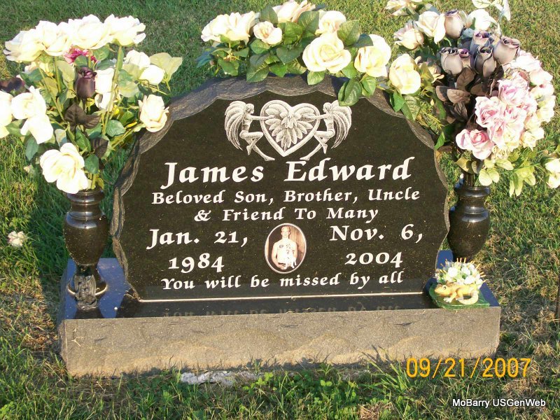 Inscription: "He will be missed by many" - Research Note: Son of James Roberson and Penny Fitzhugh. James Edward Roberson, age 20, of Monett, died Nov. 6, 2004. His death was caused from injuries sustained in a traffic accident. He was born Jan. 21, 1984, in Liberal, KS and was a die setter at the extrusion plant at EFCO Corporation in Monett and attended the Family Worship Center in Monett. - MAN KILLED IN WRECK: One person was killed and another injured in a Barry County accident last weekend. The Missouri Highway Patrol issued the following report: A Monett man died in a two-vehicle accident Saturday two miles north of Monett on Hwy. 37 at 7:55 a.m. James Roberson, 20. one of the drivers, was killed in the accident. He was pronounced dead at the scene by Barry County Coroner Skip White. Roberson's body was taken to Buchanan Funeral Home in Monett. Mahlon Richardson, 31, of Gentry, Arkansas, was the other driver. The wreck occurred when the northbound Roberson Acura Integra crossed over the center line and hit the southbound Richardson Freightliner head-on. - Back of Stone | Nov. 9, 2004, Monett Times Donna Cooper Photos Jay Trace |