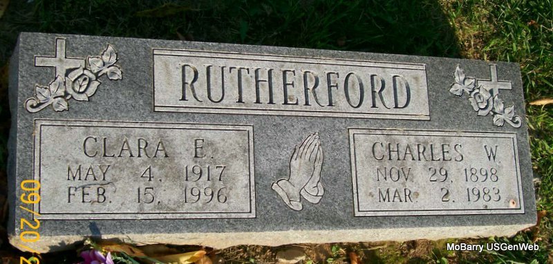 | RUTHERFORD, Charles Worth | Nov. 29, 1898 | Mar. 2, 1983 | SSW: Clara E. - Research Note: Son of Perla Hyatt Rutherford and Etta Amanda Owens. 1930 Census, he is married to Myrtle. Charles W. Rutherford, age 42, married Gladys Gibson, age 40, on Aug. 25, 1941 in Mt. Vernon, Lawrence Co., MO. His third wife was Clara Ellen (McCorkendale) (Campbell) Rutherford. | Census MO Marriage Records Phyllis Long Photo Jay Trace |