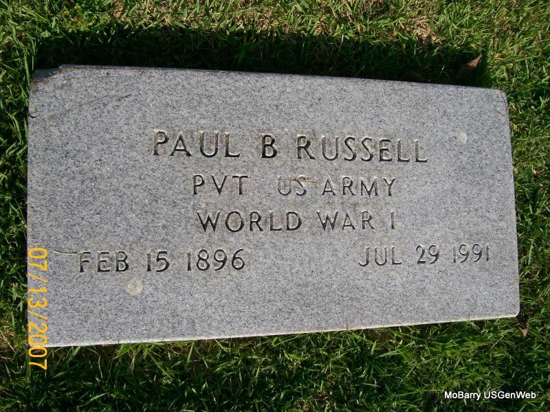 | RUSSELL, Paul Bingley | Feb. 15, 1896 | July 29, 1991 | Inscription: "PVT US ARMY WORLD WAR I" - Research Note: He is buried next to Alma (Norris ) Russell and Dr. James Russell, his parents. His wife was Vera E. Seaton. - Another Photo | Photos Jay Trace |