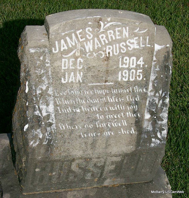 | RUSSELL, James Warren | Dec. 1904 | Jan. 1905 | Research Note: He is buried near the James Russell family. The log book has that he was buried on Jan. 2, 1905 and that Dr. J. M. Russell purchased the lot. - Another Photo | Photos Jay Trace |