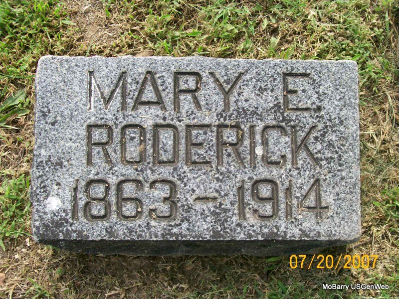 Research Note: Her death certificate reads that she was born in 1864 and not 1863 as the stone reads. It reads that she was married and at the time of her death was age 49 years, 3 months and 11 days old. The cause of her death was given as pellagra. Her father was listed as Bougher but his first name and other details about her parents were unknown to the informant. She was buried in IOOF on Mar. 14, 1914. George E. Roderick (son), Monett, MO, was the informant. Callaway Funeral Home records list her husband as William Preston Roderick. - All census records spell Bougher as Boyer. Daughter of Israel Francis Boyer/Bougher and Julia Portais. - Roderick Plot Stone | Death Certificate Callaway Funeral Home Donna Cooper Photo Jay Trace |