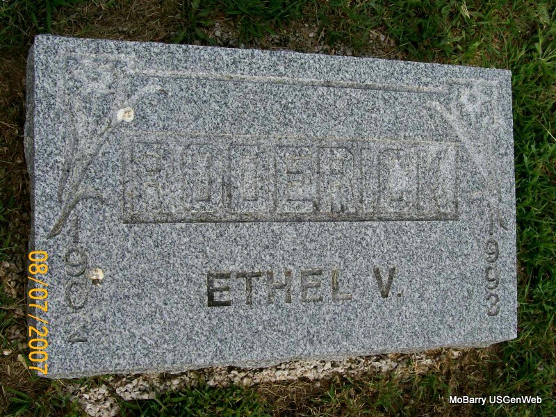 | RODERICK, Ethel Virginia (AMBER) | 1902 | 1993 | Research Note: Ethel Virginia Amber married Claude Everett Roderick on June 4, 1924 in Aurora, Lawrence Co., MO. - King - Roderick Plot Stone | MO Marriage Records Phyllis Long Photos Jay Trace |
