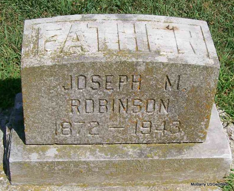 Inscription: "Father" - Research Note: His death certificate gives his birth date as Oct. 7, 1874 and not 1872 as his stone reads. He was a Frisco Engineer. His father was named Samuel Houston Robinson and his mother Mary Luscendy Sutton. Mrs. Clara Robinson, N. Central, Monett, MO, was the informant. His wife's name was given as Clara Robinson, his second wife. His first wife was Myrtle Norah Brown. | Death Certificate Donna Cooper Photo Jay Trace |