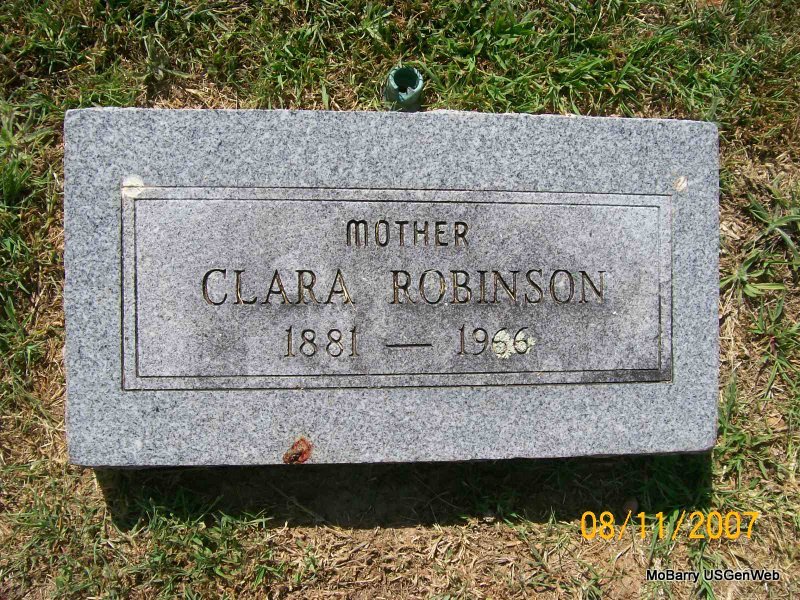 Inscription: "Mother" - Research Note: She is buried next to Frances (Davenport) McMenomoy, her daughter. The cemetery log book reads that Clara Davenport purchased the cemetery lot. Clara was buried in the old section, in block 58, in block 1, in grave 2, in the SW 1/4 and was buried Aug. 14, 1966. - Daughter of Joseph Pratt and Rose Etta Rogers. Joseph Robinson of Webster Groves, MO was the informant on the death certificate. Clara first married William F. Davenport on June 4, 1907 in Carthage Jasper Co., MO. She gave consent for her daughter to marry as Mrs. J. M. Robinson. She second married Joseph Meredith Robinson. | Note IOOF Log Book Donna Cooper MO Marriage Records Census Death Certificate Phyllis Long Photo Jay Trace |