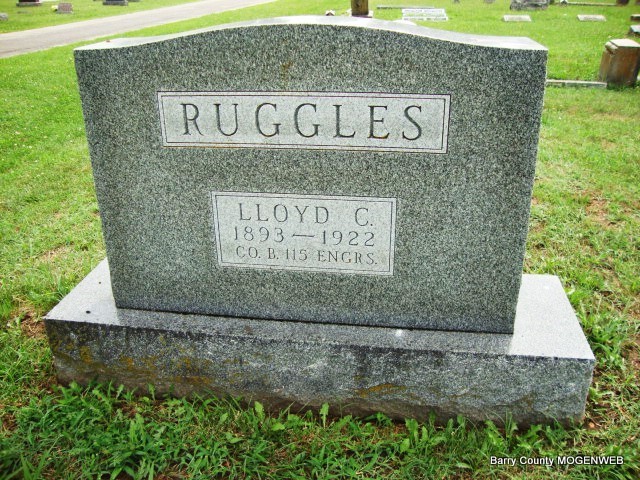 Inscription: "Co B 115 Engrs" - Research Note: This person was buried in IOOF in the old section, in block 11, in lot 1, in grave 4, in the NE 1/4 on Jan. 26, 1922, and J. W. Ruggles purchased the cemetery lot. Callaway Funeral Home Records have listed that the cause of his death was lung trouble and that he was age 29 when he died. J. W. Ruggles was his father. Son of Jasper Wesley and Effie May Ruggles. | Callaway Funeral Home Donna Cooper IOOF Log Book Census Phyllis Long Photo Connie Schmidt |