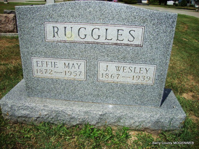 | RUGGLES, Effie May (HOWARD) | 1872 | July 1957 | SSW: Jasper Wesley - Research Note: This person was buried in IOOF in the old section, in block 11, in lot 1, in grave 6, in the NE 1/4 on July 17, 1957, and J. W. Ruggles purchased the cemetery lot. - Daughter of Hiram and Sarah Howard. J. W. Ruggles married Effie Howard on Sept. 11, 1892 in Newton Co., MO. | IOOF Log Book Donna Cooper MO Marriage Records Census Phyllis Long Photo Connie Schmidt |