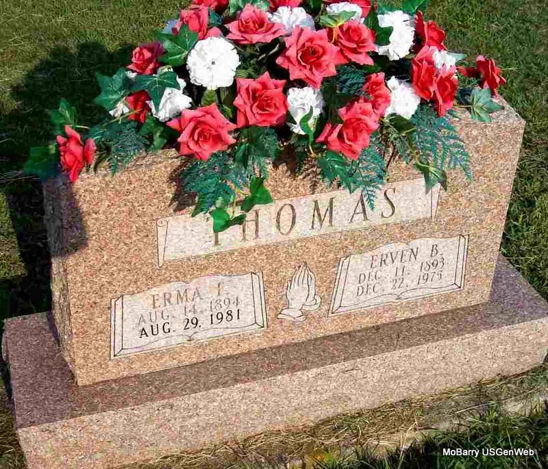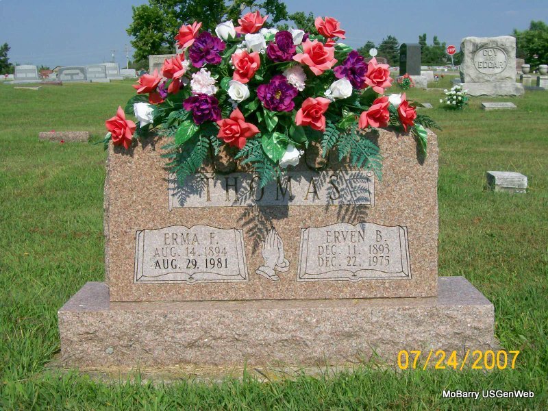 Aug. 29, 1981 | SSW: Erven B. - Research Note: Her name is given as Erma Fay on the cemetery log book. Daughter of John William Mayhew and Minnie F. Cox. Erma F. Mayhew, age 20, married Erven B. Thomas, age 22, on Jan. 19, 1916 in Lawrence Co., MO. - Another Photo | MO Marriage Records Census Phyllis Long Photo Donna Cooper Photo Jay Trace |