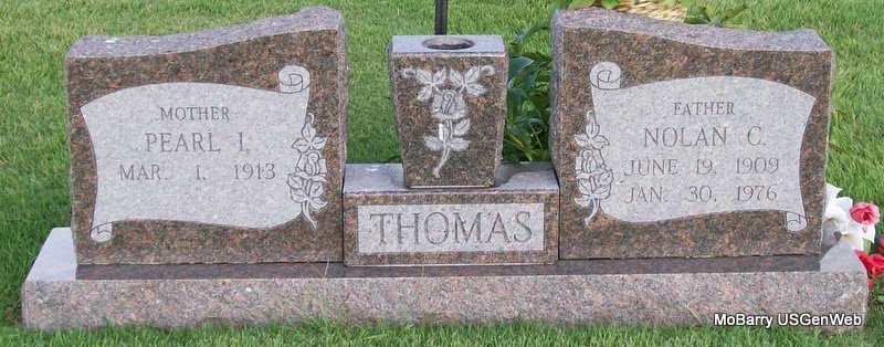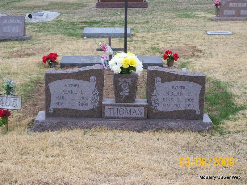 SSW: Nolan C. - Inscription: "Mother" - Research Note: Pearl Irene Worm, age 95, of Monett, died November 1 at her home. Mrs. Worm was born March 1, 1913, in Seligman, the daughter of Luther B. and Lillian (Jones) Perkins. She was a retired cook for the Monett schools and a member of the First Free Will Baptist Church. She married Nolan Thomas in Cassville, and he preceded her in death January 30, 1976. She married Gene Worm, and he preceded her in death in 1978. She was preceded in death by one son, Wesley Thomas; five brothers, Burl Perkins, Aurther Perkins, Camp Perkins, Jim Perkins, and Walter Perkins; and four sisters, Bulaha Bartgis, Nadine Easterly, Anna Parker, and Laveta Perkins. - Another Photo | Nov. 3, 2008 Monett Times Donna Cooper Photos Jay Trace |