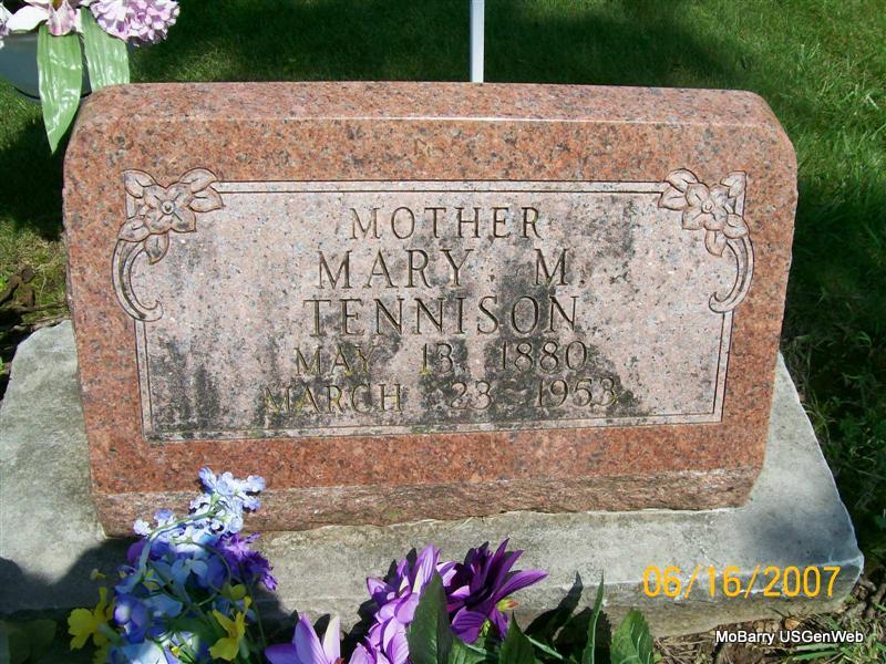 Research Note: Her death certificate reads that J. W. Tash, born Lebanon, MO, was her father. Her mother was listed as M. A. Brisendine, born Lebanon, MO. Typhoid Fever was given as the cause of death. J. W. Tash, Monett, MO, gave the information. Not listed in the cemetery log book. Jay's Note: THIS ONE IS POSSIBLY TOSH. Not on the IOOF Log book - POSSIBLY NO STONE | Death Certificate Donna Cooper Note Jay Trace |