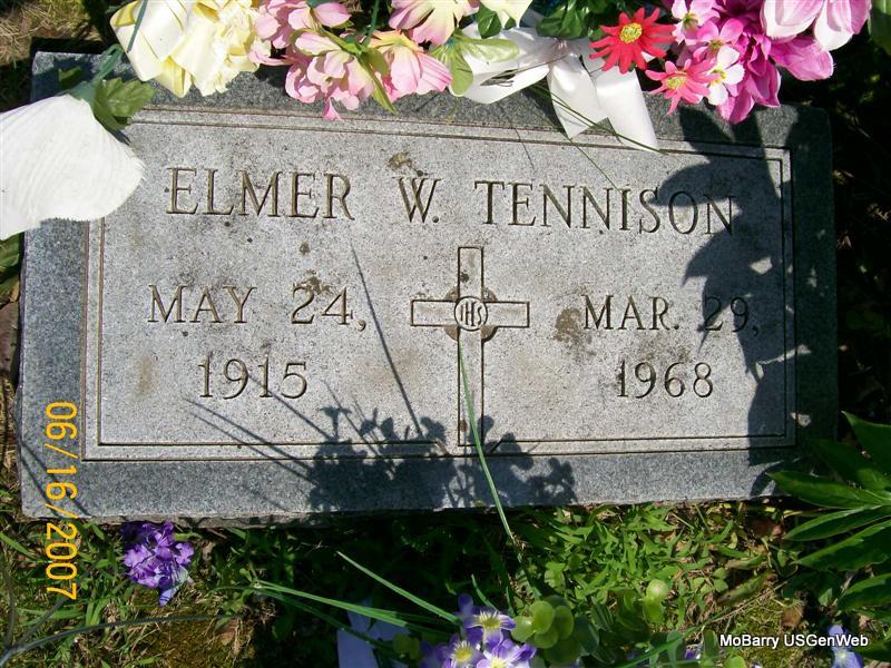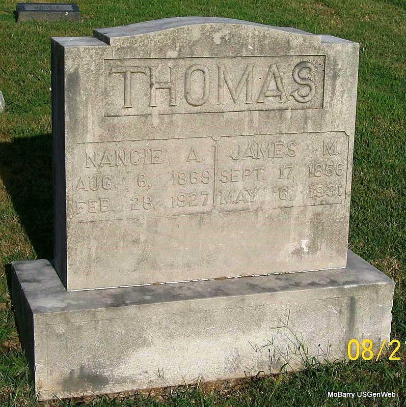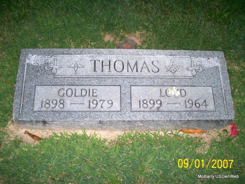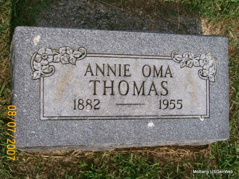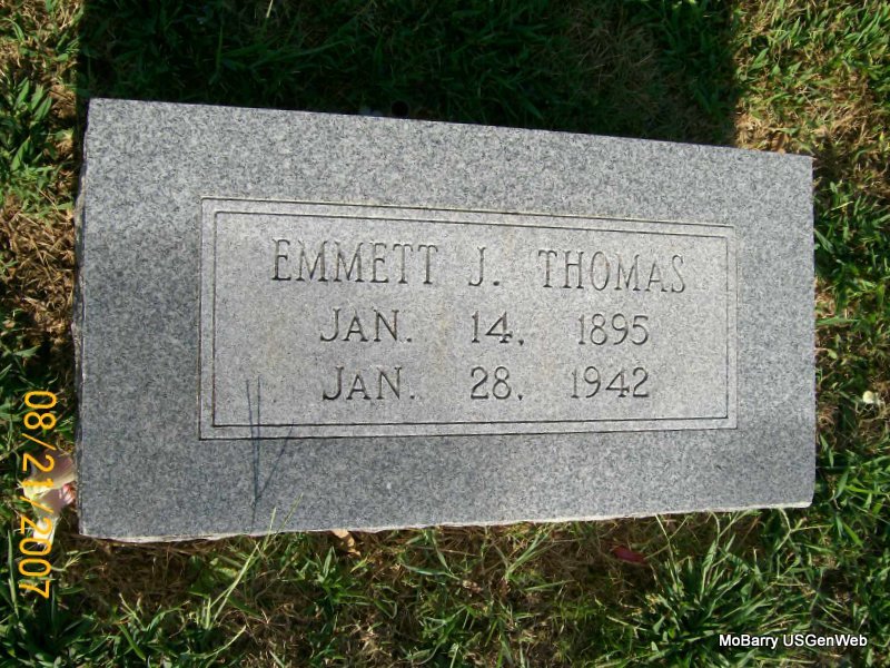 Research Note: His death certificate has his name spelled Emmitt and his stone has it Emmett. His father was given as James Willard Thomas, born Louisville, KY and his mother as Nancy Ann Kissee born Lone Oak, MO. Matt Thomas, Monett, MO was the informant. Phyllis' Note: According to the cemetery log book he was a veteran. Donna's Note: His stone reads that he died Jan. 28, 1942 and the certificate reads that he died June 28, 1942. He was buried June 30, 1942 by Callaway of Monett. The death certificate of James reads that his middle name was Millard not Willard as this one reads. | Death Certificate Donna Cooper IOOF Log Book Phyllis Long Photo Jay Trace |