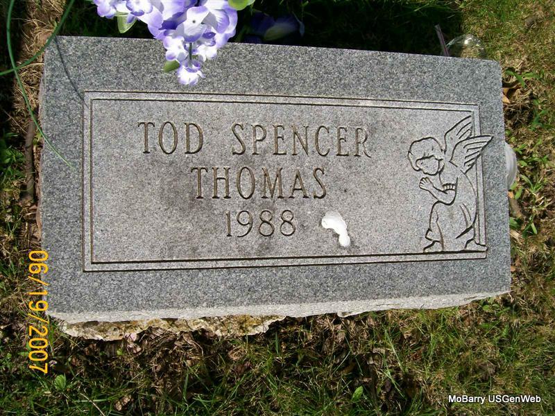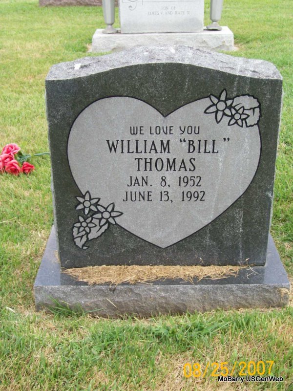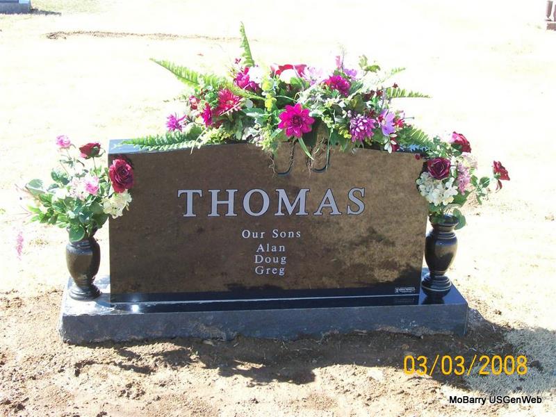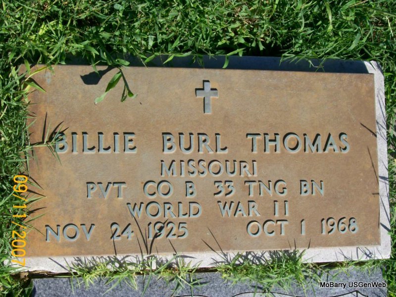 | THOMAS, Billie Burl | Nov. 24, 1925 | Oct. 1, 1968 | Inscription: "MISSOURI PVT CO B 33 TING BN WORLD WAR II" - Research Note: Son of Lorenzo Burl Thomas and Ada Valena Hogle. | Census Phyllis Long Photo Jay Trace |