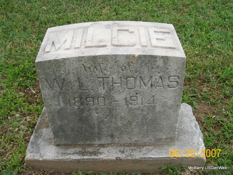 Inscription: "Wife of W. L. Thomas" - Research Note: Her death certificate lists Will Denton, born NC, as her father's name. Mary Plunk, born in McNairy Co., TN, was given as her mother's name. She died from the effects of an abscess of the lungs. Will Thomas of Monett, MO, gave the information. Her name is listed as Milcie L. on the cemetery log book. | Death Certificate Donna Cooper Photo Jay Trace |
