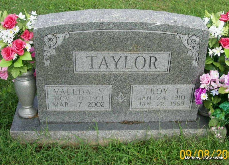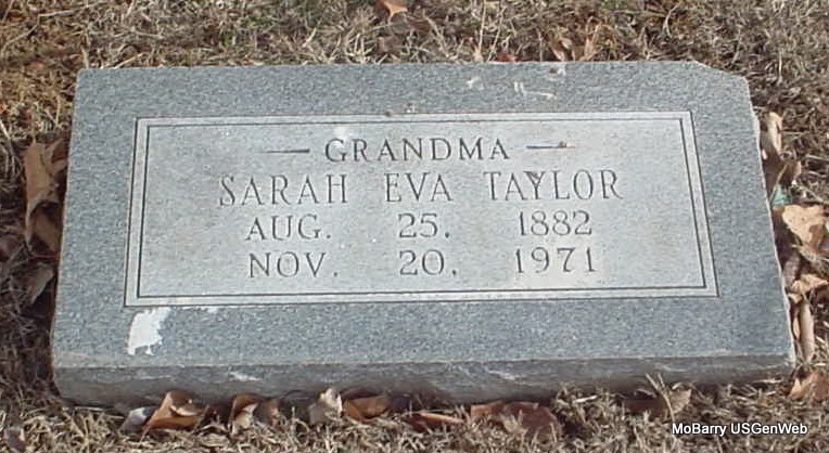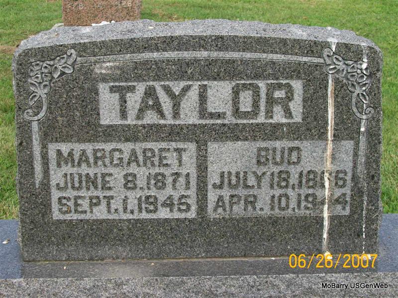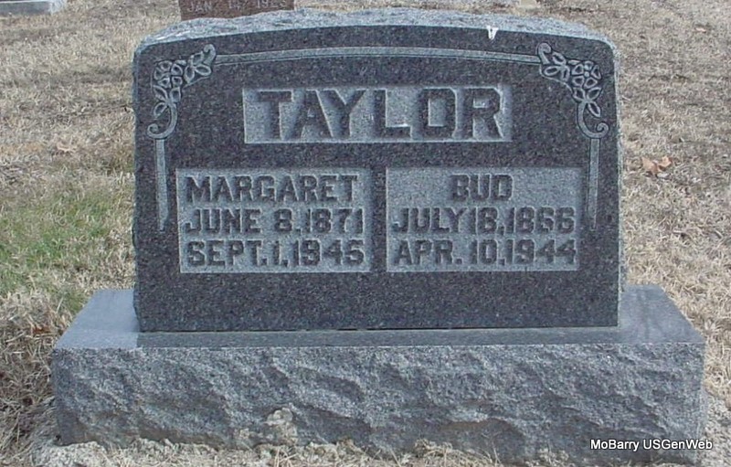 SSW: William Thomas "Bud" - Research Note: Her death certificate is filed under Ailsia Margaret Taylor, and she is in the cemetery log as Margaret S. It gives her husband's name as William "Bud" Taylor. Her father was named as Garrett Moore, born Stone Co., MO. Mary Ann Davis, born Stone Co., MO, was listed as her mother. The cause of death was given as a cerebral hemorrhage combined with hypertension and senility. She had lived in the community 43 years and was a widow. Mrs. Walter Halsey of 301 Main Street, Monett, MO, gave the information. - Wilma Fields posted: Alice Margaret (Moore) Taylor, daughter of Garrett and Mary Ann (Davis) Moore. | Death Certificate Donna Cooper Photo Wilma Fields Photo Jay Trace |