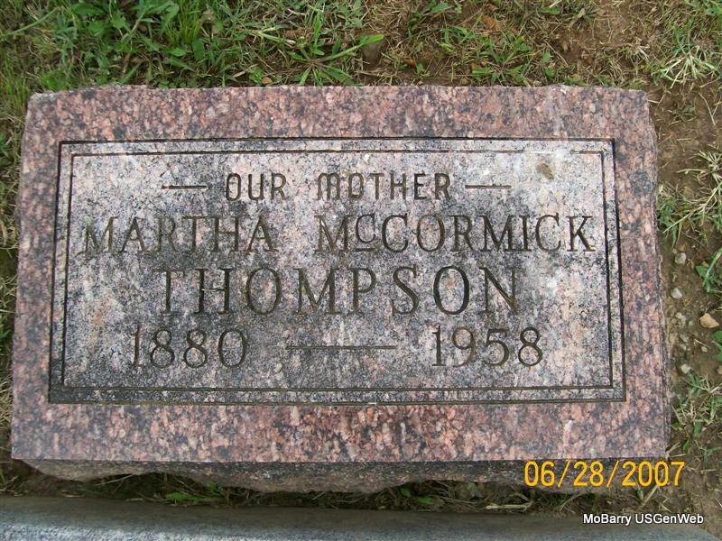 | THOMPSON, Martha Della (MCCORMICK) | 1880 | 1958 | Inscription: "Our Mother" - Research Note: She is buried next to John Raymond McCormick. John's first wife was Addie Mae Wilson, also buried by John. She died in 1945. John died in 1969. Martha could by a second wife. She is listed on the stone as Martha McCormick Thompson. | Note Phyllis Long Photo Jay Trace |