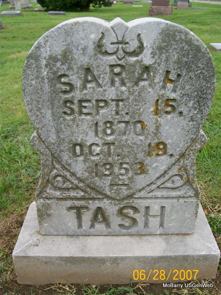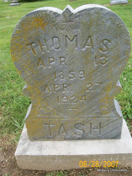 Research Note: On his death certificate, his father was given as Louis Tash. Sarah Clanton was given as his wife's name. Sam Tash gave the information. Son of Lewis and Mary "Polly" Tash. Possible first marriage: Thomas Tash married Eliza Ames on Feb. 11, 1881 in Barry Co., MO. | Death Certificate Donna Cooper Census MO Marriage Records Phyllis Long Photo Jay Trace |