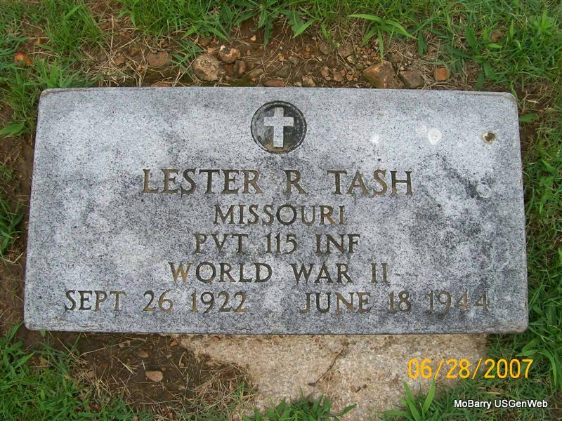 June 18, 1944 | Inscription: "MISSOURI PVT 115 INF. WORLD WAR II" - Research Note: Wheaton Journal, July 4, 1946 - WORLD WAR II HONOR LIST OF DEAD AND MISSING - Listed as DOW (persons who were wounded and later died). Son of John Thomas Tash and Ollie Jewell Holloway. | Online Newspapers Phyllis Long Photo Jay Trace |