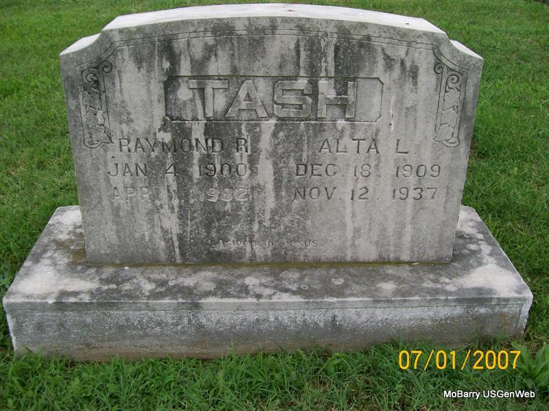 SSW: Raymond R. - Research Note: Callaway Funeral Home Records state her name spelled Tasch, and that her father was Commodore Smith, born Hannibal, MO, and her mother Nancy Ann Roller, born Lawrence Co., MO. Her stone reads Tash, She died from the effects of Hodgkin's Disease. - Alta Smith married Ray Tash on June 24, 1925 in Mt. Vernon, Lawrence Co., MO. Nancy E. Smith, mother of Alta, gave consent. | Callaway Funeral Home Donna Cooper MO Marriage Records Phyllis Long Photo Jay Trace |