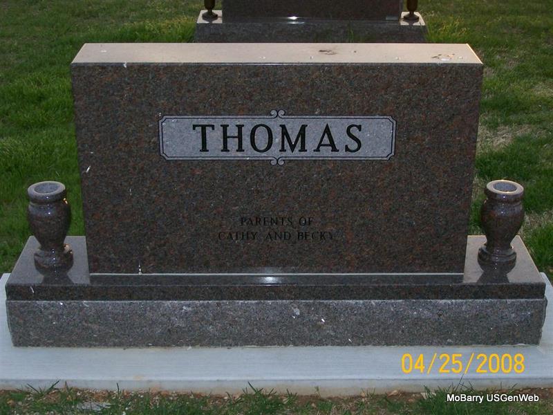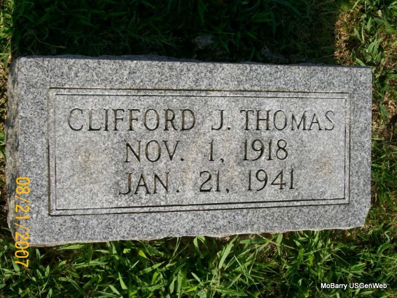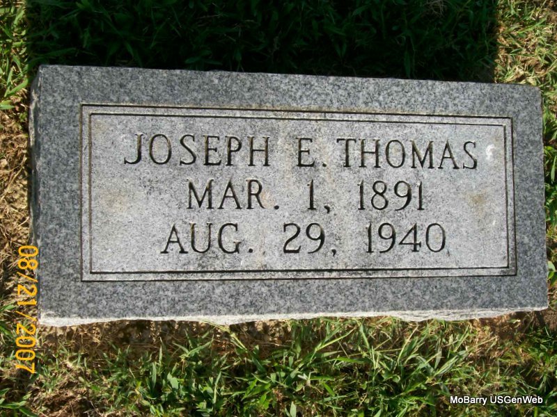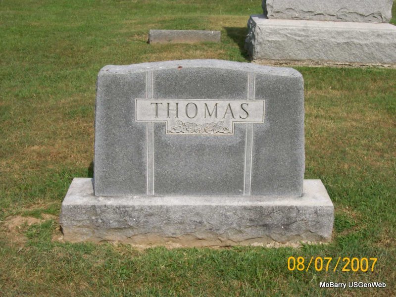Research Note: His death certificate reads that his father was Joseph Edgar Thomas, born Barry Co., MO and his mother was Emma Fisk, born Harvey Co., KS. His stone reads Jan. 21, 1941 as the death date and the death certificate reads Jan. 23, 1941. The cause of death was tuberculosis. Mrs. Emma Thomas, R. 1, Exeter, MO was the informant. 1940 census, his wife is Georgia. | Death Certificate Donna Cooper Census Phyllis Long Photo Jay Trace |