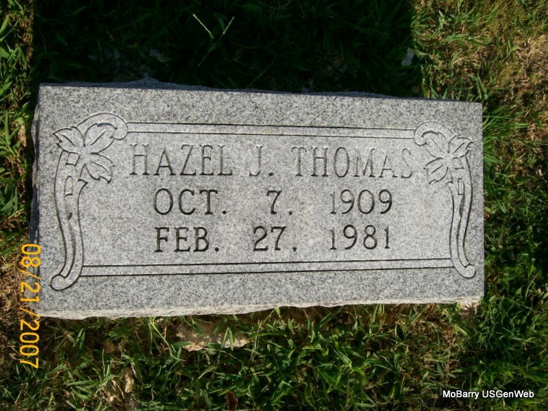 | THOMAS, Hazel J. | Oct. 7, 1909 | Feb. 27, 1981 | Research Note: She is buried next to Emma Thomas and Audrie Mae Thomas. Daughter of James Millard Thomas and Nancy Ann Kissee. | Census Phyllis Long Photo Jay Trace |