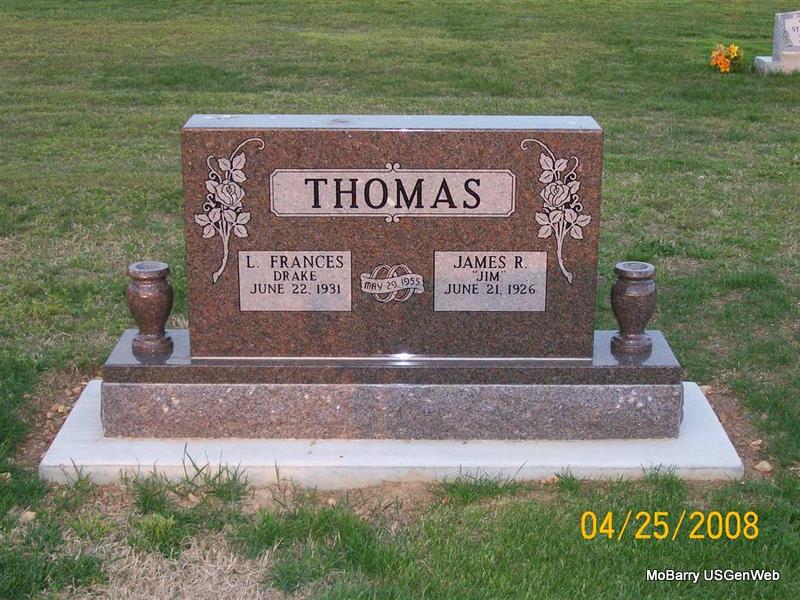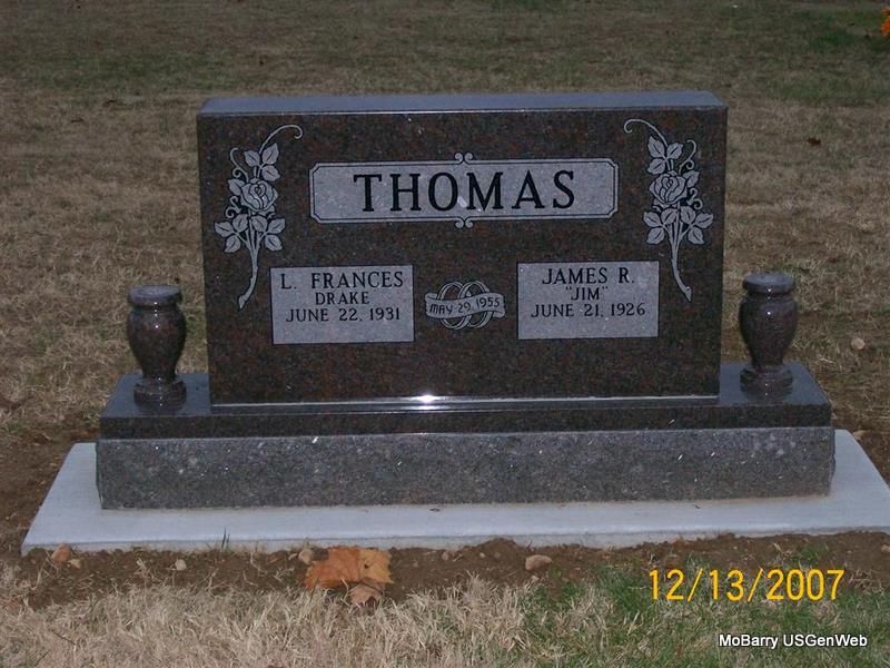 | THOMAS, L. Frances (DRAKE) | June 22, 1931 | No Date | SSW: James R. "Jim" - Inscription: "Married May 29, 1955" - Another Photo - Back of Stone | Photos Jay Trace |