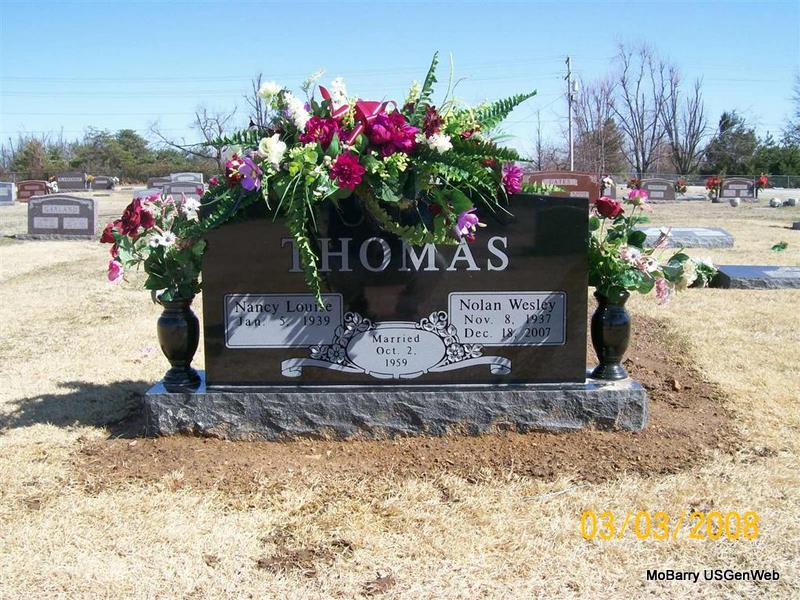 | THOMAS, Nancy Louise (ALEXANDER) | Jan. 5, 1939 | No Date | SSW: Nolan Wesley - Inscription: "Married Oct. 2, 1959" - Research Note: Her husband's obit has her maiden name included. - Back of Stone | Note Donna Cooper Photos Jay Trace |