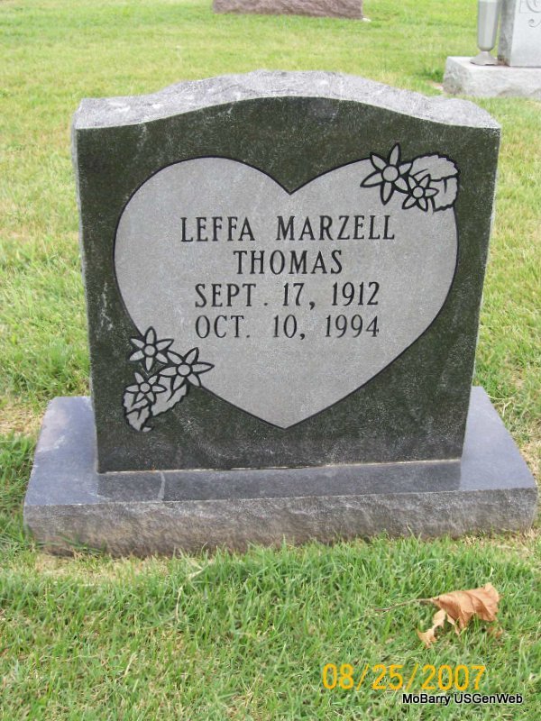 | THOMAS, Leffa Marzell | Sept. 17, 1912 | Oct. 10, 1994 | Research Note: Wife of William Thomas. She is buried next to her son William Thomas. | Census Phyllis Long Photo Jay Trace |