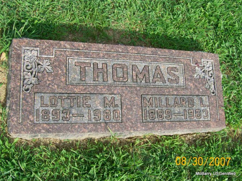 | THOMAS, Lottie M. (CAGLE) | 1893 | 1980 | SSW: Millard L. - Research Note: Daughter of William F. Cagle and Lucy Belle Tauton. Lottie Cagle married Millard Thomas on Feb. 19, 1916 in Miller, Lawrence Co., MO. | MO Marriage Records Census Phyllis Long Photo Jay Trace |