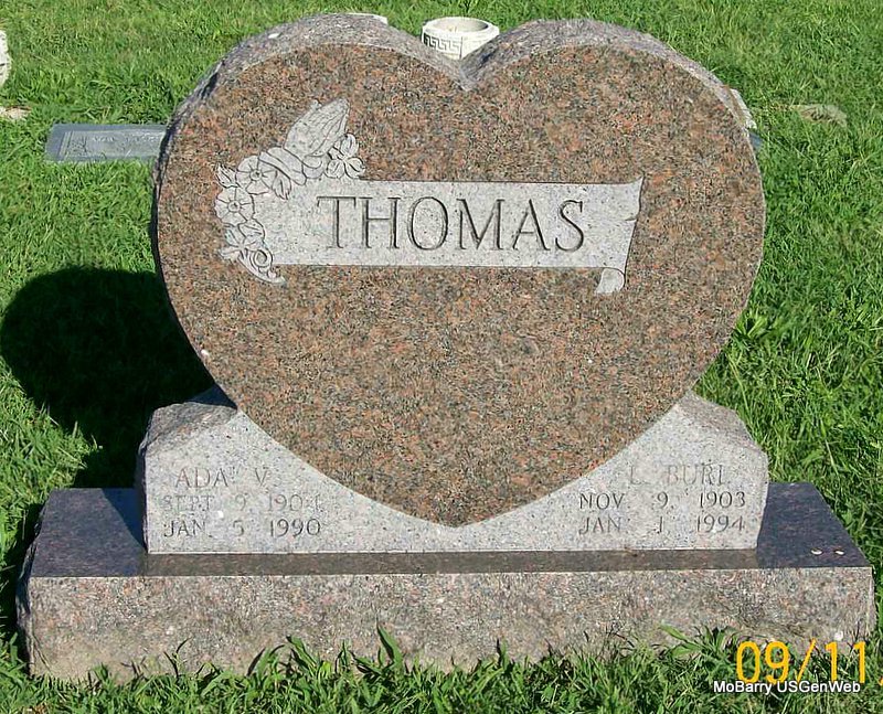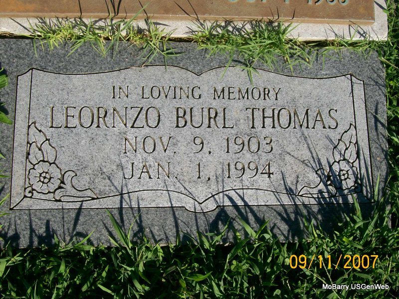 | THOMAS, Lorenzo Burl | Nov. 9, 1903 | Jan. 1, 1994 | SSW: Ada V. - Research Note: Son of Lorenzo P. Thomas and Berry Ann English. Lorenzo B. Thomas married Lena (Ada Valena) Hogle on Aug. 5, 1922 in Neosho, Newton Co., MO. L. P. Thomas, father of L. Burl Thomas, gave consent. Charles S. Hogle, father of Lena, gave consent. - Another Stone - Inscription: "In Loving Memory" | MO Marriage Records Census Phyllis Long Photos Jay Trace |