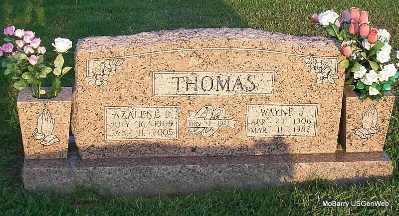 SSW: Wayne J. - Inscription: "May 2, 1927" - Research Note: She was age 95, and a daughter of Elbert and Cordeilla (McCellan) Crouch, married Wayne Thomas on May 2, 1927, in Verona, and he preceded her in death March 11, 1987, preceded in death by one son, Wayne Thomas Jr.; and one daughter, Phillis Washburn. | Monett Times, Jan. 12, 2005 Mary Homesley Photo Jay Trace |