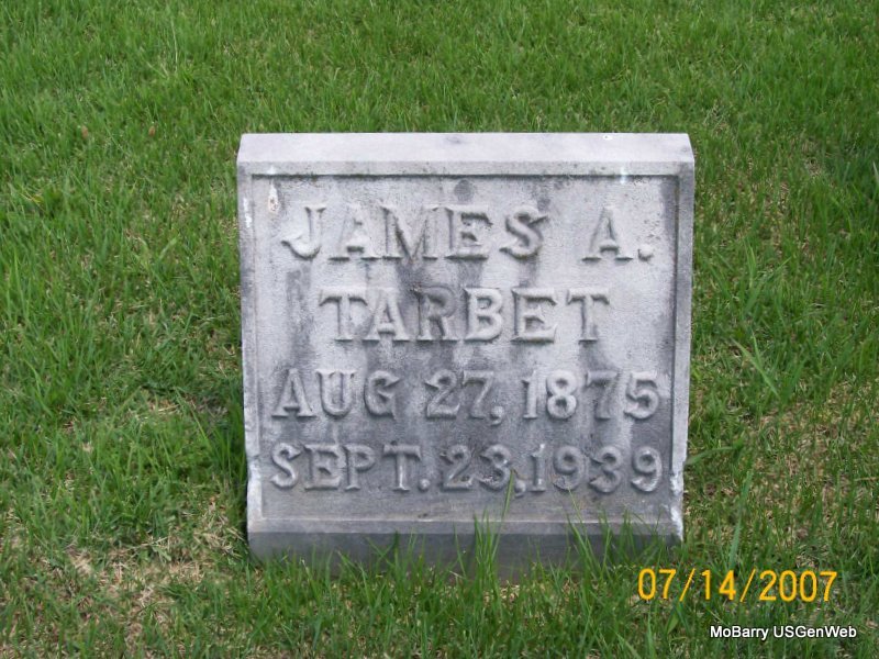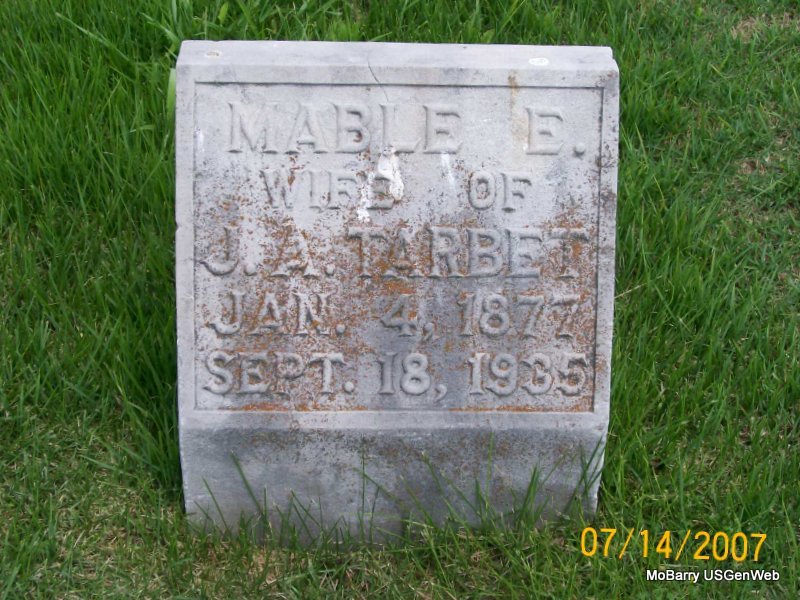 Sept. 18, 1935 | Inscription: "Wife of J. A. Tarbet" - Research Note: Mable E. Van Natter, age 18, married James A. Tarbet, age 21, on Feb. 7, 1897 in Pierce City, Lawrence Co., MO. - Tarbet Plot Stone | MO Marriage Records Phyllis Long Photo Jay Trace |