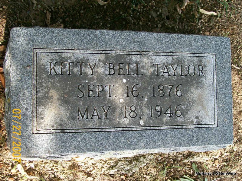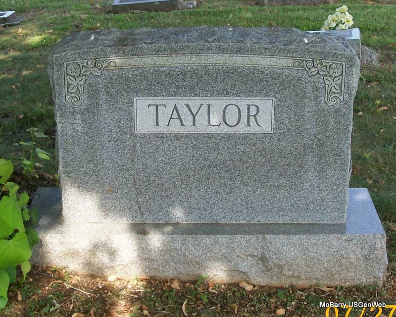 Research Note: Donna's Note: The death certificate has 1877 as the birth year and the stone has 1876. Phyllis' Note: Her husband was named Winfield S. Taylor, living, age 73. She was a daughter of Alfred Edmondson Bell born England and Katherine Hanna born Isle of Man. Husband W. S. Taylor of Monett, MO was the informant. Cause of death, head injury from fall in the home. - Another Photo | Note Donna Cooper Death Certificate Phyllis Long Photo Wilma Fields Photo Jay Trace |