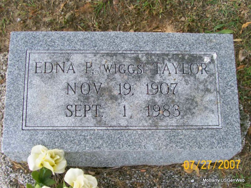 | TAYLOR, Edna P. (WIGGS) | Nov. 19, 1907 | Sept. 1, 1983 | Research Note: She is listed in the cemetery log book as buried in the 1st section, in block 50 in lot 1, in grave 8, in S 1/2. Winford Taylor purchased the lot and she was buried Sept. 7, 1983. Daughter of Winfield S. Taylor and Kitty Bell, listed on this page. - Taylor Plot Stone | IOOF Log Book Donna Cooper Census Phyllis Long Photo Jay Trace |