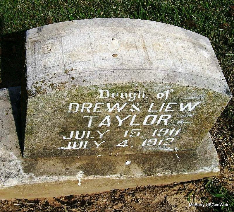 Inscription: "Daugh. of Drew and Lew Taylor" - Research Note: The cemetery log book has her located in the old section, in block 26, in lot 2 in grave 5, in NE 1/4 and she was buried July 4, 1912. Drew Taylor purchased the lot. Her death certificate reads that Drew Taylor was her father, born MO, and Lew Waterman, born MO, her mother. She was 11 months and 4 days old at the time of her death. The cause of death was cholera infantum and the death certificate reads that she was buried July 5, 1912 and not the 4th as the log book reads. Her name is spelled Eloease on her death certificate, and on the log book it is Ellouise. | IOOF Log Book Death Certificate Donna Cooper Photo Jay Trace |