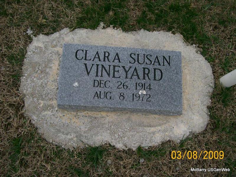 | VINEYARD, Clara Susan (NEWMAN) | Dec. 26, 1914 | Aug. 8, 1972 | Research Note: Daughter of Oscar and Sarah Newman. Second wife of John Vineyard. According to the cemetery log book she was buried in the 2nd section, in block 9, in lot 3, in grave 2 in the SW 1/4 on Aug. 8, 1972 and John Vineyard purchased the lot. Log book reads that she has no stone - which is incorrect. | IOOF Log Book Donna Cooper Census Phyllis Long Photo Jay Trace |