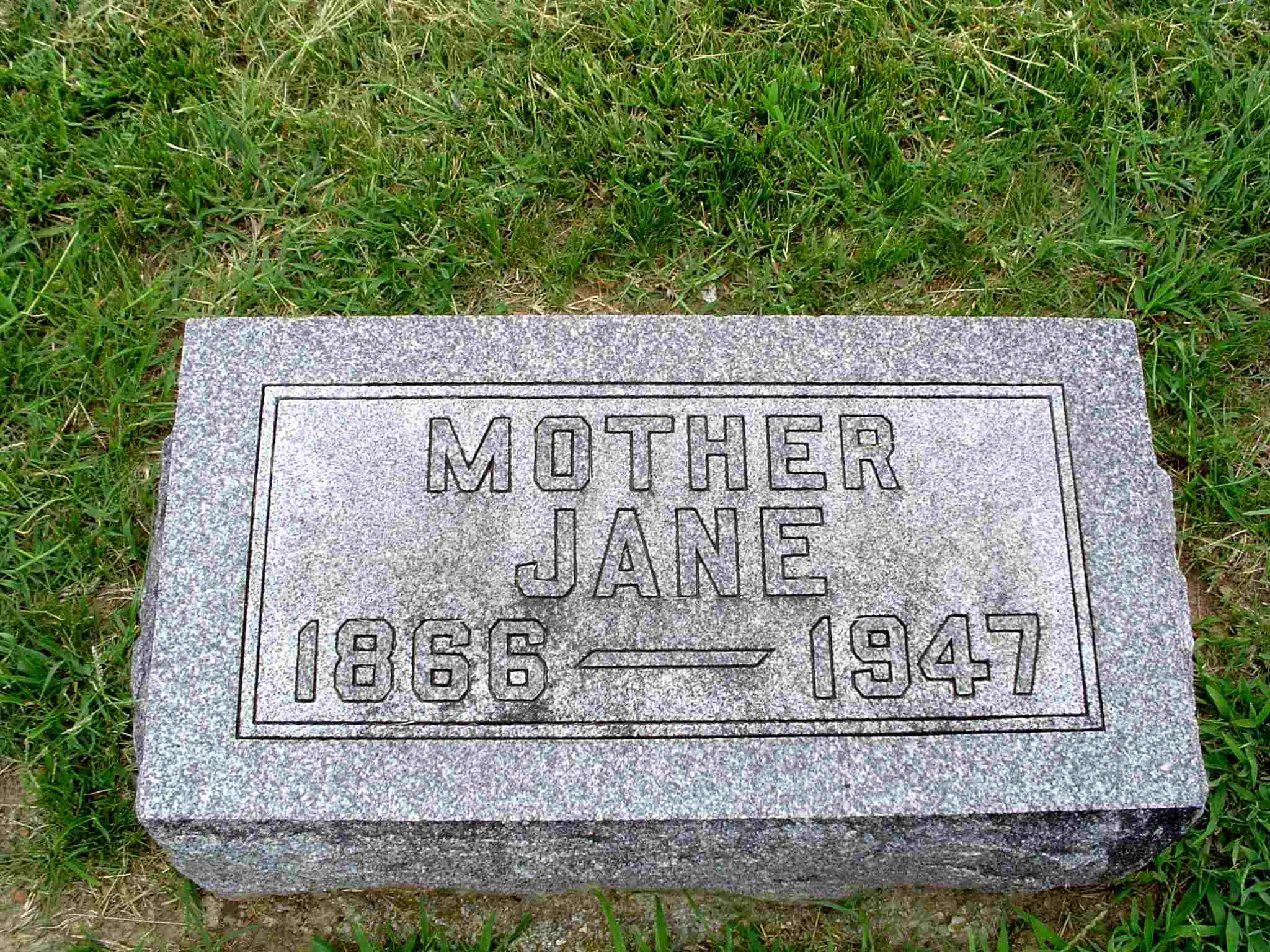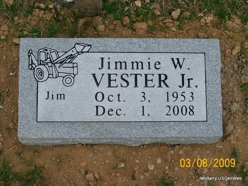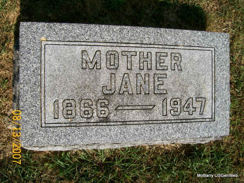 Inscription: "Mother" - Research Note: She was a Moore from Flat Creek. There is a death certificate on file with this death date for Nancy, which reads that her father was George Moore, born TN, and her mother Nancy Carney, born MO. She lived her entire life in Barry County. O. U. Vermillion, 411 W. Dunn, Monett, MO, was the informant. Phyllis' Note: Wife of Burrell Vermillion. Burrell Vermillion married Jane Moore on Jan. 12, 1890 in Barry Co., MO. She was widowed twice and is listed on the cemetery log book as Jane B. - Vermillion Plot Stone - Another Photo | Headstone Rod Smith IOOF Log Book Census MO Marriage Records Phyllis Long Death Certificate Photos Donna Cooper Photo Jay Trace |