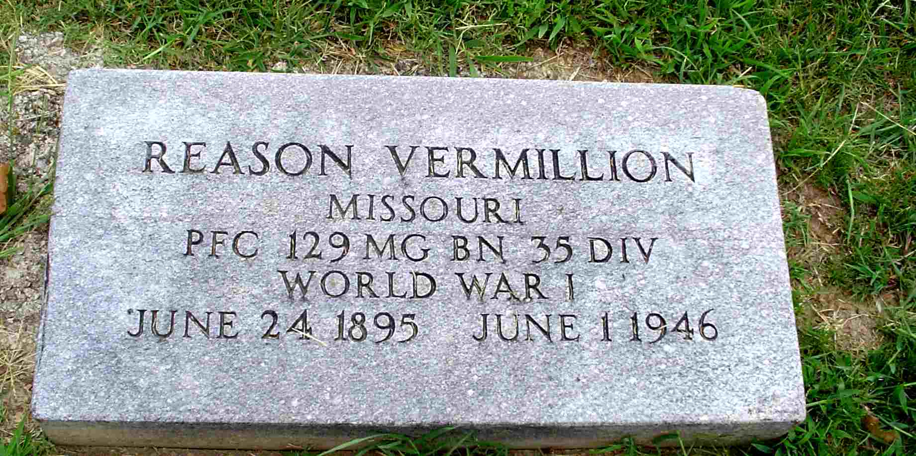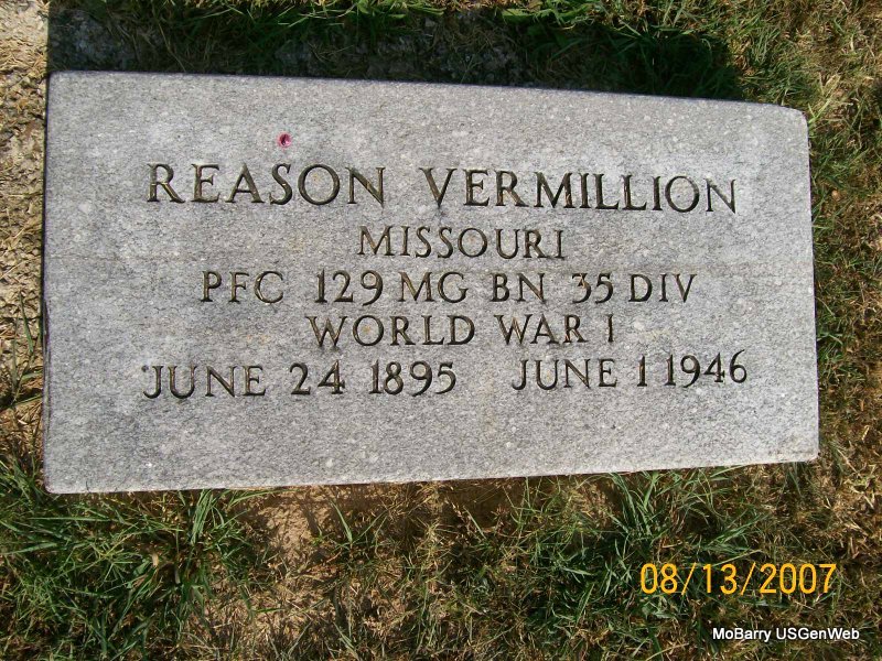 Inscription: "PFC 129 MG BN 35 DIV, WW I" - Research Note: Son of Burrell Vermillion and Nancy Jane Moore. - Cassville Republican,Thursday, March 21, 1918 - Reason Vermillion, son of Burl Vermillion of Monett, was at home last week on a furlough. - Vermillion Plot Stone - Another Photo | Headstone Rod Smith Photos Donna Cooper Online Newspapers AR Death Index Phyllis Long Photo Jay Trace |