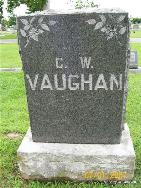 Research Note: Charley was a son of Marion and Melvina (Marshall) Vaughan and husband of Etna Naomi (McArtor) Vaughan. Charles Vaughan, age 25, married Etna McArtor, age 21, on Nov. 29, 1893 in Barry Co., MO. Phyllis Note: He was widowed twice and a son of Marion Vaughan born IN and Melvina Marshall. Mrs. Clara Cochran of Birmingham, AL was the informant. - January 4, 1912, Thursday, Cassville Republican - Chas. Vaughn of Monett was in Cassville Saturday transacting business and made this office a pleasant call. Mr. Vaughan says that he can barley wait for the paper to come each week as in it he finds all the news. - Another Stone with C. W. Vaughan on it. | Headstone Janice Vaughan Family Group Sheet Death Certificate Online Newspapers MO Marriage Records Phyllis Long Photo Jay Trace |