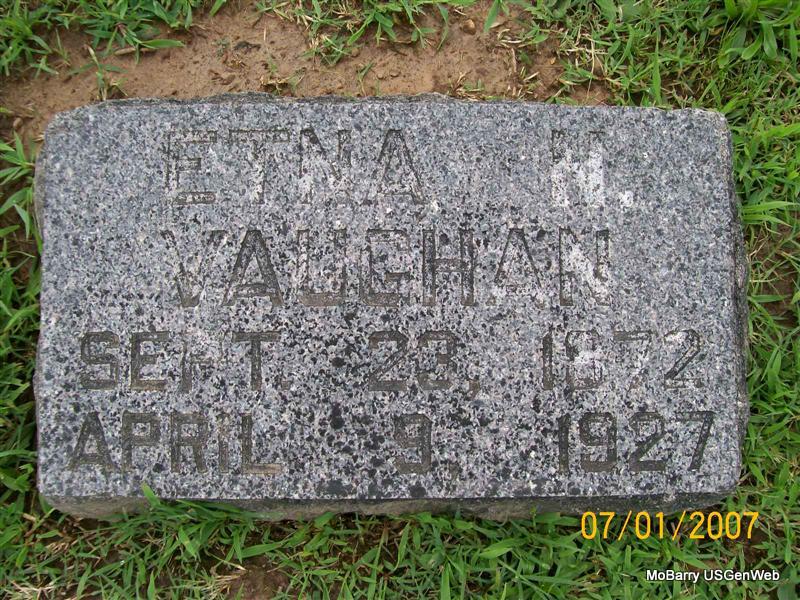 Research Note: Wife of Charles W. Vaughan. Her death certificate gives her birth year as 1873 but the stone reads 1872 as posted by Janice and she was a daughter of James H. McArtor and Elizabeth (Hawk) (McArtor) Vaughan. - Charles Vaughan, age 25, married Etna McArtor, age 21, on Nov. 29, 1893 in Barry Co., MO. | Headstone Janice Vaughan Family Group Sheet Death Certificate MO Marriage Records Phyllis Long Photo Jay Trace |