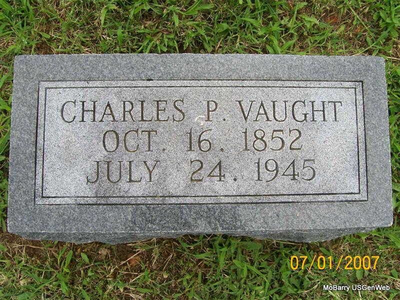Research Note: His death certificate names Jane (Eubanks) Vaught, deceased, as his wife. His father was given as Abraham Vaught, born near Somerset, KY, and his mother was given as Serena Ann Patton, born near Somerset, KY. His usual address was 510 W. Logan, Monett, MO, and he had lived in the Monett community for 40 years. He was age 90 yrs, 9 months and 8 days old. Mrs. E. J. Shepherd, 510 W. Logan, Monett, MO, gave the information. - His first wife was Jane Eubanks. - Cassville Republican, October 8, 1914 - Mrs. Chas. P. Vaught of Monett died Tuesday. She had been in poor health a number of years. The remains were brought here Wednesday and interred at the Oak Hill Cemetery. - He second married Ellen Roberts, died 1884, also buried at Oak Hill Cemetery. - November 9, 1907, Saturday, Cassville Democrat - Monett Times: Chas. P. Vaught and wife have gone to Kentucky to visit their old home at Eubanks. They have been away 40 years. | Death Certificate Donna Cooper Online Obits Online Newspapers Phyllis Long Photo Jay Trace |