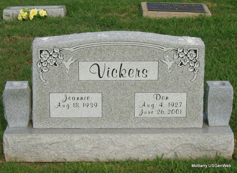 | VICKERS, Donald Williamson | Aug. 4, 1927 | June 26, 2001 | SSW: Jeanie - Research Note: Donald Williamson Vickers, age 73, of El Paso, Texas, formerly of Monett, died June 26, 2001, following a long illness. Burial was in Fort Bliss National Cemetery in El Paso, Texas. Monett Times, July 17, 2001. Son of George Calvert Vickers and Lillian A. Williamson. Donald W. Vickers, age 44, married Patricia A. Acree, age 26, on May 30, 1972 in El Paso, TX. | Monett Times, July 17, 2001 Donna Cooper Census TX Marriage Index Phyllis Long Photo Jay Trace |