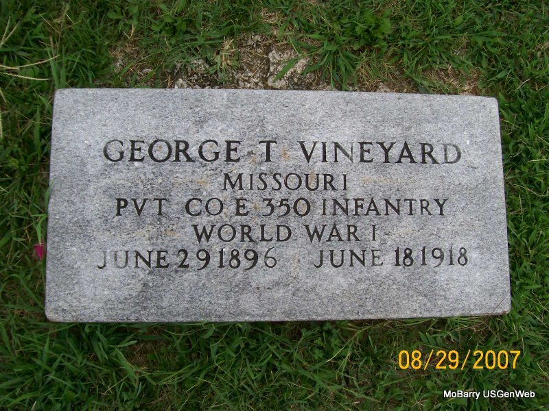 June 18, 1918 | Inscription: "MISSOURI PVT CO 3 350 INFANTRY WORLD WAR I" - Research Note: Son of George Washington Vineyard and Nancy Virginia Moore. - Cassville Republican, June 27, 1918 - The body of George Thomas Vineyard who was drowned in the Des Moines River arrived at Monett Sunday morning accompanied by Corporal Peterson. Funeral services were held at the Sloan Hotel at 2 o'clock Sunday afternoon, conducted by Rev. Francis Goodnight of Purdy and Rev. J. F. King of Monett. Internment was made in Odd Fellows' Cemetery. Just how the young man came to his death probably will never be known. He was one of the Monett boys in training at Camp Dodge. He left the camp without permission Saturday. On Tuesday his body was found in the Des Moines River. He had evidently been in the water two or three days. He was clothed in his uniform. The condition of the body was such that identification could not be made except by a letter in the young man's pocket. The delay in sending the body home was due to having to wait for instructions from Washington before the body could be disposed of. George T. Vineyard (known here as Tom) and his brother Orlando came to Monett and about six years ago from Crane. They worked a part of the time for J. B. Burg as teamsters. After he received his call, George worked at odd jobs about town. He was 23 years old. Just before leaving for camp he was married to Lea Nelson the youngest daughter of Mrs. White of this place. Monett Times | Online Obit Census Phyllis Long Photo Jay Trace |