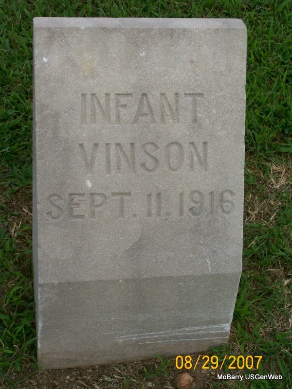 Research Note: The stone has one date on it and no name. The death certificate gives Emmet Vinson as the father, born Odessa, MO, and the mother as Sarah Curry, born Monett, MO. The cause of death was an injury during birth, lack of oxidation. The informant was for Mrs. Thomas Curry, Monett, MO | Death Certificate Donna Cooper Photo Jay Trace |