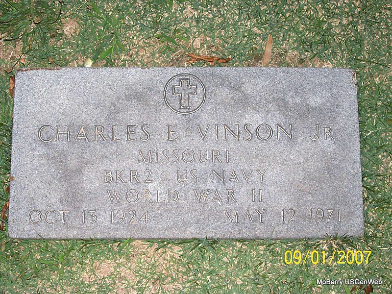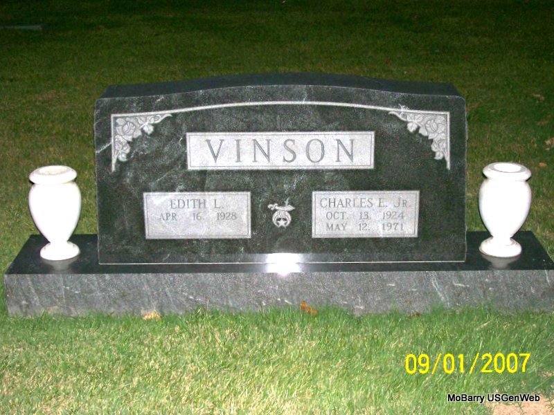 | VINSON, Charles Emmett, Jr. | Oct. 13, 1924 | May 12, 1971 | SSW: Edith L. - Research Note: He was a son of Charles Emmett and Helen (Raines) Vinson. - Another Stone - Inscription: "MISSOURI BKR2 US NAVY WORLD WAR II" | Census Photo Jay Trace |