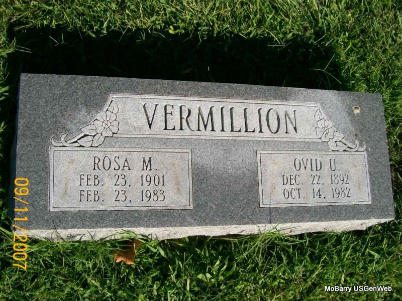 | VERMILLION, Rosa Mae (OWENS) (WALTERS) | Feb. 23, 1901 | Feb. 23, 1983 | SSW: Ovid - Research Note: Rosa was Ovid's wife and an aunt of Keith Owens. Rod Smith, Niceville, Florida. She first married Ray B. Walters and second Ovid Vermillion. Daughter of Wiley C. Owens and Artella Moudy. | Headstone Note Rod Smith Census Phyllis Long Photo Jay Trace |