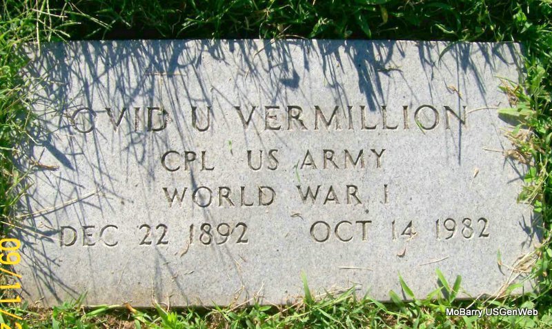 | VERMILLION, Ovid Uriah | Dec. 22, 1892 | Oct. 14, 1982 | SSW: Rosa M. - Research Note: Son of Burrell Vermillion and Nancy Jane Moore. Full name Ovid Uriah Vermillion. Lived in Monett his entire life. Footstone reads - Cpl U.S. Army WW I. - Military Stone - Inscription: "CPL US ARMY WORLD WAR I" | Headstone Rod Smith Census Phyllis Long Photo Jay Trace |