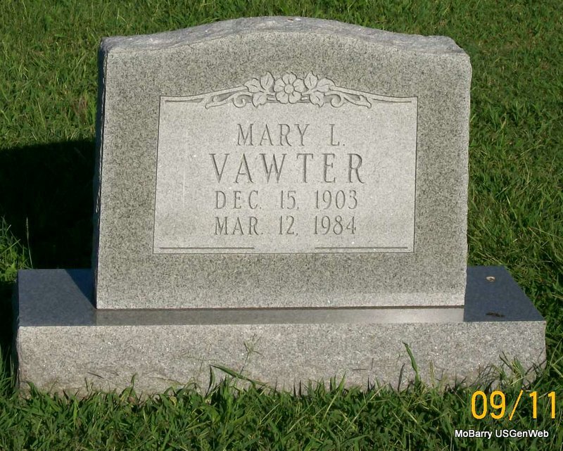 | VAWTER, Mary L. | Dec. 15, 1903 | Mar. 12, 1984 | Research Note: May have been the wife of Phillip Vawter. Mary Lucinda Lewis of Exeter, Barry Co., MO, married Phil Vawter of Joplin, Jasper Co., MO, on Nov. 16, 1940 in Cassville, Barry Co., MO. Daughter of Archie and Martha (Long) Lewis. | MO Marriage Records Census Phyllis Long Photo Jay Trace |