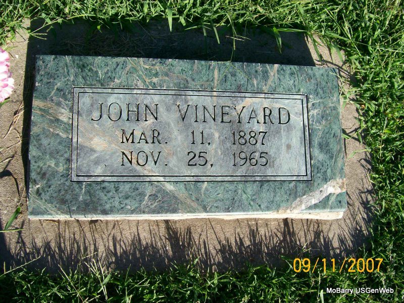 Research Note: Son of Mary E. Sisco and George Washington Vineyard. John Vineyard married Ocie Ann Lemons on Jan. 25, 1908 in Dallas Co., MO. He second married Clara Newman. | MO Birth Records Phyllis Long Photo Jay Trace |