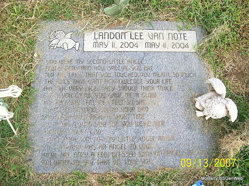 Research Note: He was a son of Gary Lee and Amanda (Balmas) Van Note. He was preceded in death by his maternal great grandmother, Dorothy Anderson. The log book reads that he is without a stone but he Does have a stone. | IOOF Log Book Monett Times Phyllis Long Photo Jay Trace |