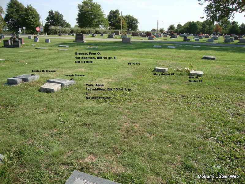 Research Note: Photo shows location of grave. Anna was buried in the first section, in block 15, in lot 1, in grave 2 and has no stone. There is nothing about when she died or who purchased the lot given on the log book. Her death certificate reads that the cause of death was chronic diabetes. Archie P. York was listed as her husband and she was age 51 years, 11 months and 10 days old when she died. Her father's name was ____ Henry and all the other details about her parents was unknown to the informant. Blankenship of Purdy, MO, was the undertaker. Archie York went to Monterey, CA after Annie's death according to census. NO STONE | IOOF Log Book Death Certificate Donna Cooper Census Phyllis Long Photo Connie Schmidt |
